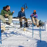 Sustenance Under The Sun Gorellaume, Tyler Heal and Michel Gignac, left-right, and take a lunch break Tuesday creating a snow sculpture in the Shipyards Park for the Yukon Rendezvous.