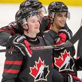 Celebration Mode Canada’s Alexis Lafreniere, left, the Yukon’s Dylan Cozens, centre,