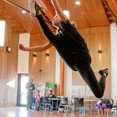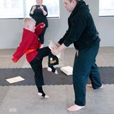 Flying Knee N60 Combative Arts student Gauis Flinger Lowe breaks a wooden board