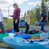 Gearing Up Steph Leson (left) talks to Lee Vincent about her creek boat for sale.